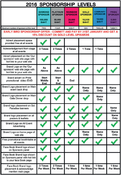 - Feature your brand in a range of media and publications (see sponsorship levels page for full details). Our sponsorship from Phuket News group is valued at over 500,000 Baht and depending on your sponsorship level, your brand logo could appear in all the advertisements.
